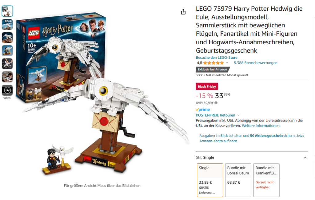 19.11.2023 – Wir kaufen EGO 75979 Harry Potter Hedwig die Eule, Ausstellungsmodell bei Amazon (Black Friday Angebot).